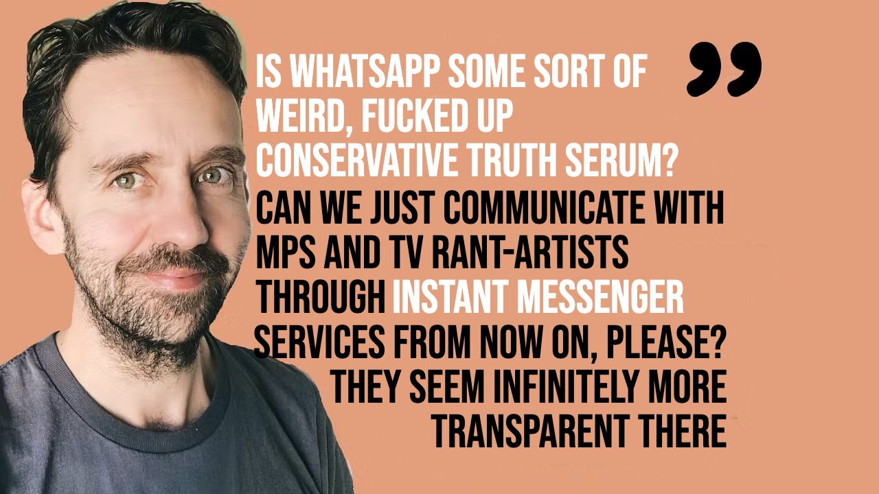 Is WhatsApp a sort of weird, fucked up conservative truth serum? Can we just communicate with MPs and TV rant-artists through instant messenger services from now on, please? They seem infinitely more transparent there. It's just on camera and on radio they come out with bullshit. Maybe we should always have access to their exchanges? I'm not one to pry. But if it's prying over murderous insurrections and sending riddled-with-Covid grandmas out to carehomes like respiratory viruses are a new category on Deliveroo, I'll probably take a peak.