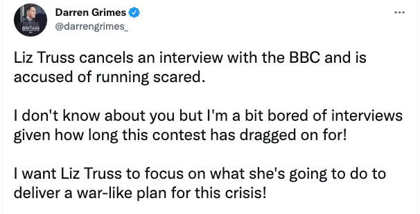 "I want Truss to focus on what she's going to do to deliver a war-like plan for this crisis!", he continued. Well, quite. But the mind boggles: if she runs away from scrutiny like this, how will anyone ever hear about it?