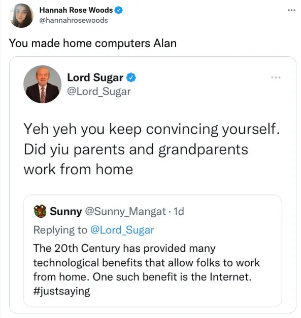 Next up was everyone's favourite market trader turned gameshow host, Lord Sugar, who decided to take time out from his property portfolio to tell us, again, that we should trek into the office. Apparently because someone's ancestors, somewhere, used to do something similar. He reminds me of the Student Debt Republicans who - purely on the basis they suffered, themselves (many of them didn't) - want every generation after to also suffer the indignity and challenge of being saddled with $100,000 of student debt.