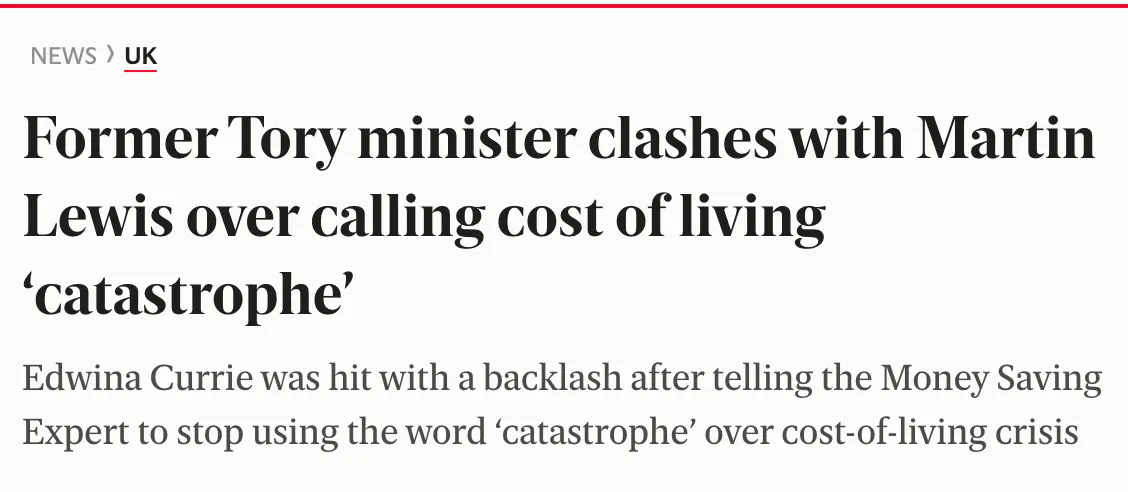 Finally, former Tory minister, Edwina Currie raised a laugh this week. Or perhaps it was a sobbing, inconsolable sigh. It's difficult to tell where one meets the other these days. Currie quoted the much-loved Money Saving Expert, Martin Lewis - a guy who's only ever tried to help people fight consumer exploitation - and told him not to use words like catastrophe. In terms of fighting accusations that Tories just don't get it this ranks somewhere between "voters are just jealous of my very, very large house" and Let Them Eat Cake.