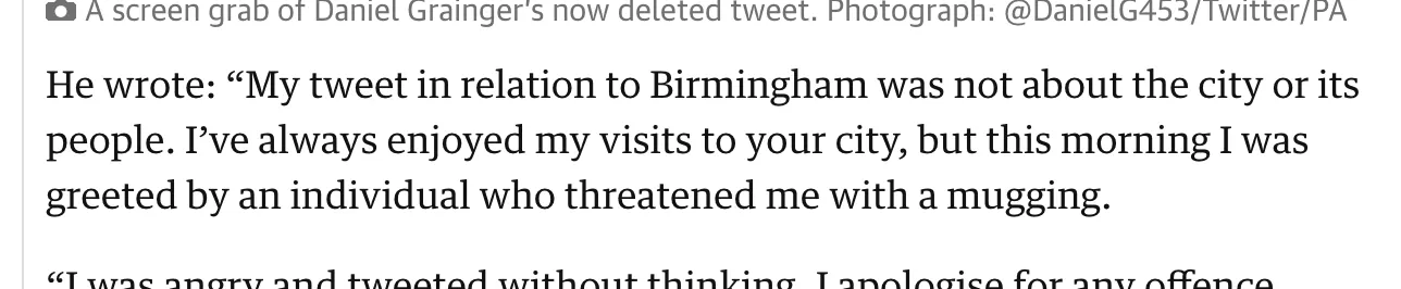 "My tweet in relation to Birmingham was not about the city or its people," he clarified, leaving readers confused as to what it *could* have been about. Another Birmingham? The one in Alabama? Cabbages? Des Lynham? "I’ve always enjoyed my visits to your city, but this morning I was greeted by an individual who threatened me with a mugging".