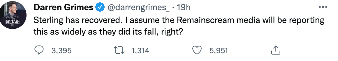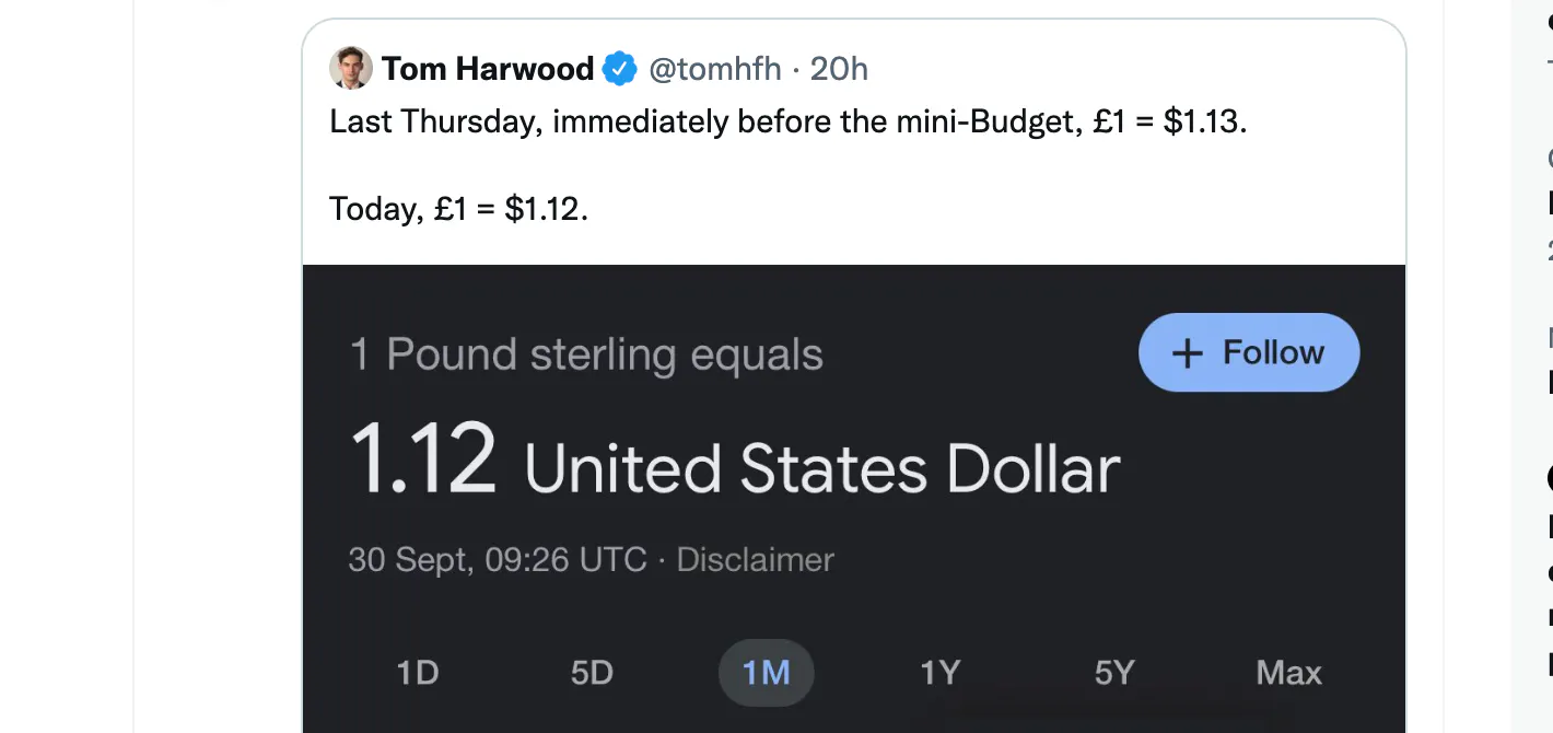 Face-value flag-fuckers whose inquiring minds and critical thought extend solely to "oh, the graph went up again". No acknowledgement of the BoE intervention or Truss/Kwarteng finally agreeing to sit down with the OBS - and of how these two things may have helped, slightly, to restore confidence, and nudged up Sterling up again. No. It's all just "investors must have seen the light!". The plan is *suddenly* amazing.
