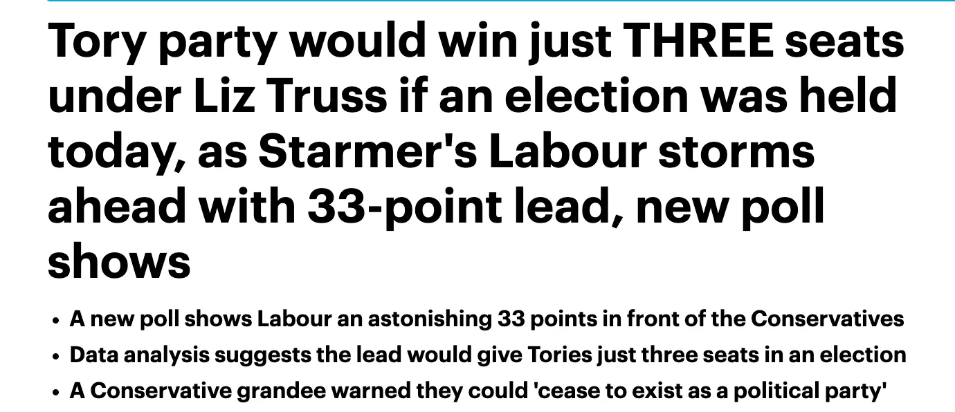 A party that's tanking in the polls, a PM with the worst approval-rating ever recorded by Opinium, a Tory administration fighting factionalised warfare, a 4-week old Govt that's ballsacked its reputation on the world stage (Minibudget Chaos, the N.I. Protocol); Honestly, to see them seal-clapping Truss as she walks onstage is hilarious. Do they honestly still like her? Perhaps the Jury's out. One thing's for certain: the Truss Bounce is showing all the spring and joy of a toddler falling from a Juliet balcony.